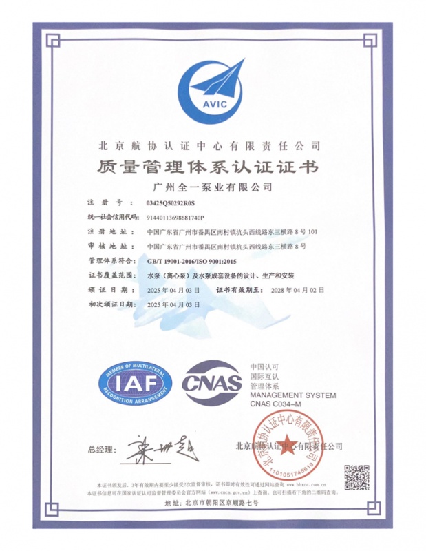 2025 年新春之际,扎根广州市番禺区的老牌广州水泵厂—— 广州全一泵业有限公司(品牌 “广全一”)传来重磅捷报:凭借健全的质量管理体系与过硬的产品实力,公司顺利通过 GB/T 19001-2016/ISO 9001:2015 质量管理体系认证,为这家成立超 15 年的国家级高新技术企业再添国际权威背书,彰显番禺本土制造的品质底气。
