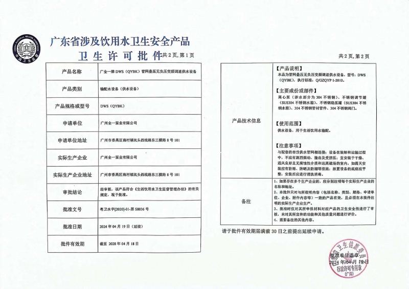 近日,广州全一泵业有限公司自主研发生产的广全一牌 DWS(QYBK)管网叠压无负压变频调速供水设备,成功通过广东省卫生健康委员会严格审核,正式取得《广东省涉及饮用水卫生安全产品卫生许可批件》(批准文号:粤卫水字 [2020]-01 - 第 S8036 号)。这一权威认证,不仅是对公司产品卫生安全品质的国家级认可,更彰显了广州全一泵业作为水泵行业领军高新企业,在供水设备研发、生产全流程中严谨专业的管控能力与行业领先的技术实力。