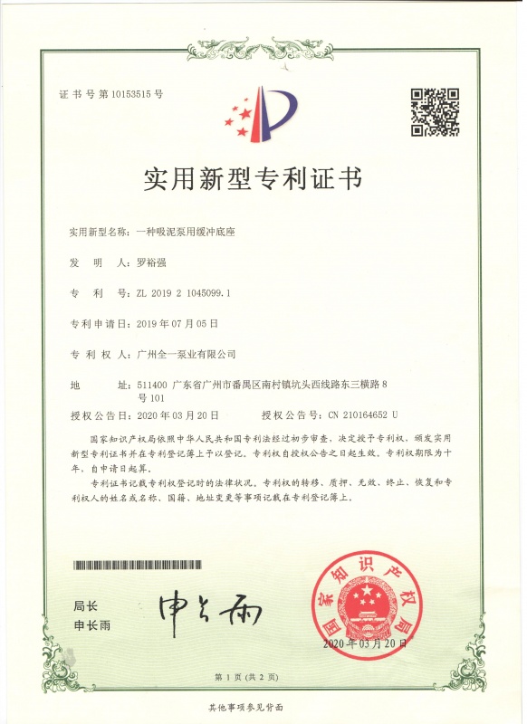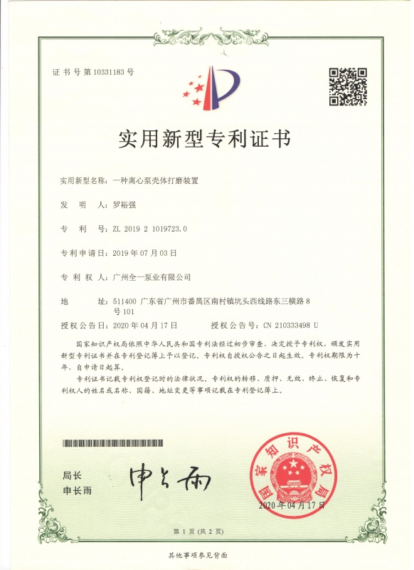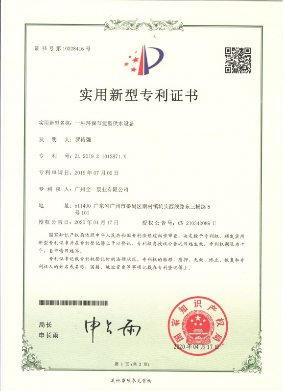 2020 年,是广州全一泵业有限公司技术自研与创新突破的关键一年。作为深耕水泵与供水设备领域的高新技术企业,公司始终坚持 "技术立企、自主研发" 的核心战略,聚焦工业流体输送、市政供水、环保清淤等场景痛点,全年多项自主研发技术斩获国家知识产权局实用新型专利授权,以硬核专利成果夯实行业技术优势,彰显企业在产品性能、工艺精度、节能稳定、场景适配等维度的核心竞争力。